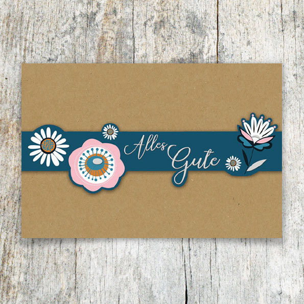 Versenden Sie stilvolle Glückwünsche mit dieser hochwertigen Grußkarte aus stabilem, braunem Kraftkarton. Die fest integrierte, blaue Banderole mit floraler Formstanzung und silbergeprägtem Schriftzug „Alles Gute“ verleiht der Karte ein elegantes Finish – perfekt für besondere Anlässe wie Jubiläen, Gratulationen oder geschäftliche Glückwünsche.